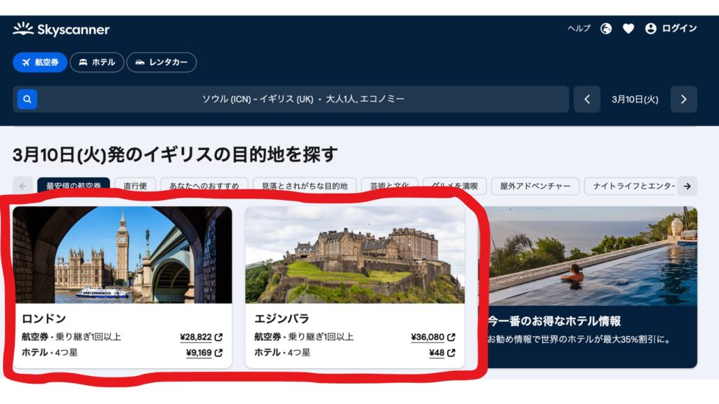 仁川→イギリスで2万円台で航空券が売っていることもあります。