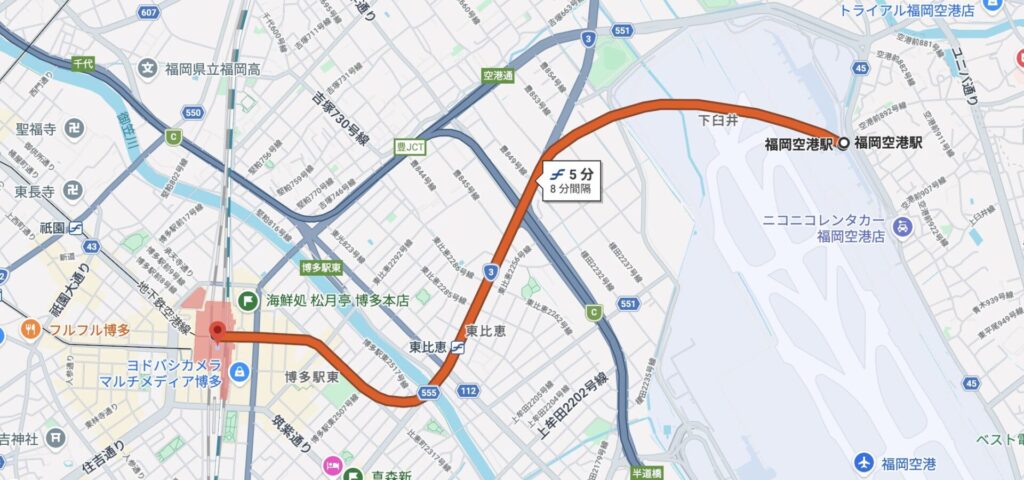 実際に福岡空港駅→東比恵駅→博多駅と2駅で行けてしまいます。